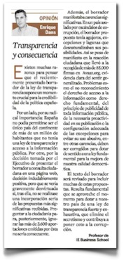 Mi columna de esta semana en el diario Expansión se titula «Transparencia y consecuencia» (pdf), y habla de la presentación del borrador de la importantísima ley de transparencia, de sus agujeros y lagunas, y de cómo la buena idea de abrir una página para llevar a cabo un proceso de revisión del mismo por parte de la ciudadanía trae ahora consigo una lógica consecuencia: ahora, las sugerencias y aportaciones, más de tres mil seiscientas, deben ser tenidas en consideración si se quiere que el proceso tenga realmente sentido y no quede como una simple declaración de intenciones. Tocamos el tema anteriormente en esta otra entrada titulada «La enorme importancia de la transparencia«.