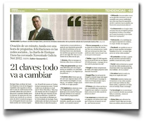 Xabier Sanmartín, de El Correo Gallego, estuvo en la conferencia y ha publicado una crónica de la misma titulada «21 claves: todo va a cambiar» (ver en versión pdf). Además estuve en Banda Ancha, en la Radio Galega (falando no meu enferruxado galego, empieza en torno al minuto 12), hay una crónica en Hardmaníacos, y próximamente un artículo de Código Cero.