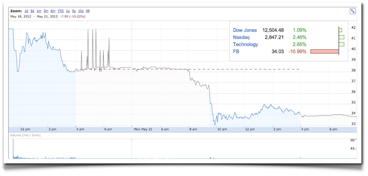 En el gráfico, la evolución del valor de Facebook tras dos días en el NASDAQ, después de perder el sostén que le proporcionaban los bancos de inversión implicados en la colocación. Si el primer día sirvió para ajustar el valor desde la ilusoria salida a $42 hasta el precio de salida de $38, el segundo ha traído consigo el descenso hasta los $33, más de un 11% por debajo de su precio original, y algunas perspectivas apuntan a una estabilización hacia el final de la semana entre los $20 y los $30. En este momento, la compañía ya ha perdido más de catorce mil millones de dólares sobre su valoración original, y Mark Zuckerberg personalmente, más de dos mil millones.