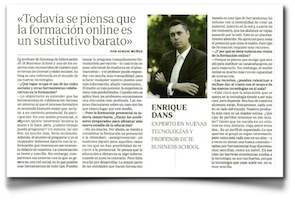 Sergio Muñoz, de ABC, me llamó el pasado viernes para pedirme opinión acerca de la formación online, sus perspectivas, las percepciones que todavía la rodean, y el impacto de la crisis sobre la misma. Lo publicó ayer domingo bajo el título «Todavía se piensa que la formación online es un sustitutivo barato» (pdf).