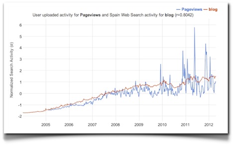 El procedimiento es tan simple como entrar en Correlate, pedir la opción «Enter your own data», y o bien subir un archivo en el formato adecuado, o bien incluso copiar y pegar datos desde una hoja de cálculo a la cuadrícula que te muestra en la aplicación, más fácil imposible. La gráfica, tomada a modo de ejemplo, muestra una correlación muy notable (r=0.8) entre las páginas vistas en este blog y las búsquedas de la palabra «blog» en España, relativamente obvia pero que no esperaba tan elevada.