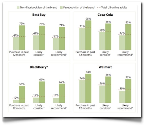 Los resultados son claros: los «Likes» de Facebook representan, en una proporción estadísticamente significativa, una actitud de «embajador» de la marca, con un valor cifrado en su inclinación a comprar y a recomendar la compra. La probabilidad de que un fan en Facebook considere la adquisición de un producto es 4 veces mayor que la de un no-fan, la de que finalmente adquiera el producto es 5.3 veces superior, y la de que lo recomiende a un tercero, 4.7 veces superior. Tener un número elevado de «Likes» en Facebook no solo garantiza un buen canal de comunicación a través del cual difundir noticias y novedades sobre la marca y sus productos o servicios, sino que además, redunda directamente en las ventas y en la recomendación. En este sentido, el valor de las campañas de publicidad en Facebook no es tanto el de generar operaciones de compra, sino el de atraer atención hacia la página de la marca y poder trabajar con esas personas que se aproximan y hacen «Like» en la misma.