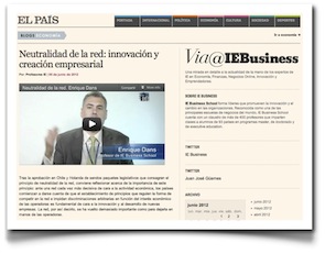 En Vía@IEBusiness, el blog de IE Business School en El País, un pequeño vídeo de tres minutos , titulado «Neutralidad de la red: innovación y creación empresarial» y dedicado a analizar el impacto de la neutralidad de la red en la competitividad de los países al hilo de las recientes decisiones en Chile (reglamentación final de una ley previamente aprobada en agosto de 2010) y en Holanda que consagran dicho principio por ley.