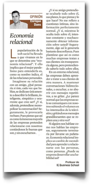 Mi columna en Expansión de hoy se titula «Economía relacional» (pdf), e intenta trasladar a papel un paralelismo con el que juego cada día más en cursos y conferencias: el de las relaciones personales como forma de entender las relaciones empresariales en una economía caracterizada por un entorno bidireccional. Por supuesto, la comparación suena intencionadamente provocativa y se aleja muchísimo del comportamiento habitual de la mayoría de las empresas a día de hoy, pero estoy convencido de que vivimos una evolución en ese sentido, y que muchos de los usos y costumbres en comunicación corporativa, en marketing y en publicidad que hoy nos parecen perfectamente normales, dentro de no demasiado tiempo no lo serán, y los evocaremos como un recuerdo casi extravagante.