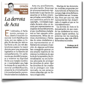 Mi columna de esta semana en Expansión se titula «La derrota de ACTA» (pdf), y es una adaptación para formato y público del diario en papel de mis opiniones e interpretaciones sobre la importancia de la humillante y categórica derrota que el Acuerdo Comercial Anti-Falsificación (ACTA) sufrió en el Parlamento europeo.