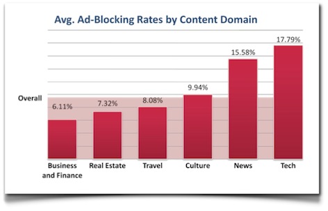 Un informe realizado por una empresa israelí, ClarityRay, titulado «Ad-blocking, measured« y que ha realizado seguimiento de más de cien millones de impresiones en publicaciones de todo tipo en Europa y los Estados Unidos, logra aproximar la magnitud del uso de bloqueadores de publicidad en el navegador: en media, un uso del 9.26%, que llega a ser del 17.79% en sitios de contenido tecnológico con una audiencia más sofisticada en este ámbito, del 15.58% en sitios de noticias generales, y que llega a ser de un 50% en algunos sitios específicos. Si te interesa el tema, te recomiendo que sigas este interesante hilo de discusión al respecto en Quora.