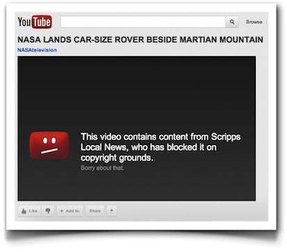 Una prueba más de la enorme estupidez que supone el actual sistema de copyright: una reclamación falsa de una compañía cualquiera sobre el primer vídeo de la llegada de la sonda Curiosity a Marte subido por la NASA de manera completamente legítima a YouTube provoca su inmediata retirada.