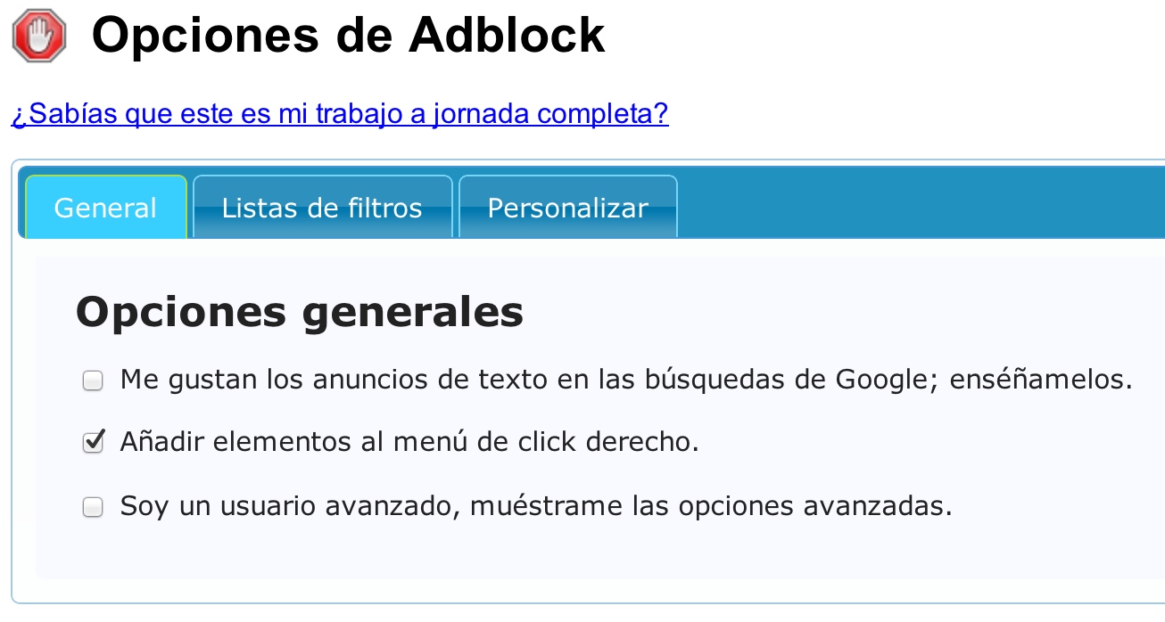 - Instala AdBlock Plus en tu navegador y, una vez instalado, vete a sus opciones generales y asegúrate de que la opción «Me gustan los anuncios de texto en las búsquedas de Google; enséñamelos.» está desmarcada. AdBlock Plus es una herramienta genial, pero peligrosa: usándola sin definir listas blancas podrías estar privando a tus páginas favoritas de sus fuentes de ingresos. Te recomiendo que vayas a esas páginas, a aquellas en las que la publicidad no te resulta especialmente molesta pero a las que quieres apoyar económicamente, y pulses el botón de AdBlock Plus para dejarlo en verde. Un pequeño gesto, pero que quienes están detrás de las páginas que lees todos los días agradecerán. Si se trata de sitios que abusan de la publicidad y te resultan molestos, déjalos bloqueados. Ya aprenderán. Y ya puestos, si quieres contribuir al sostenimiento económico del desarrollador de AdBlock Plus, puedes hacerlo donando la cantidad que quieras en el enlace que pone «¿Sabías que este es mi trabajo a jornada completa?»