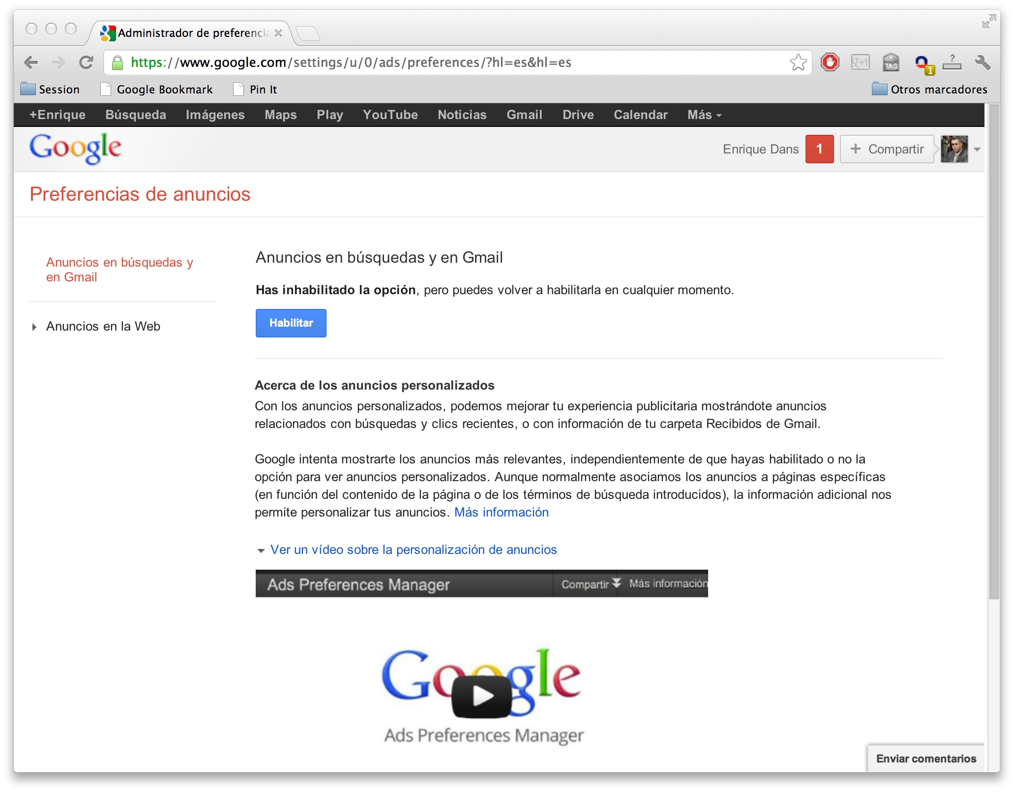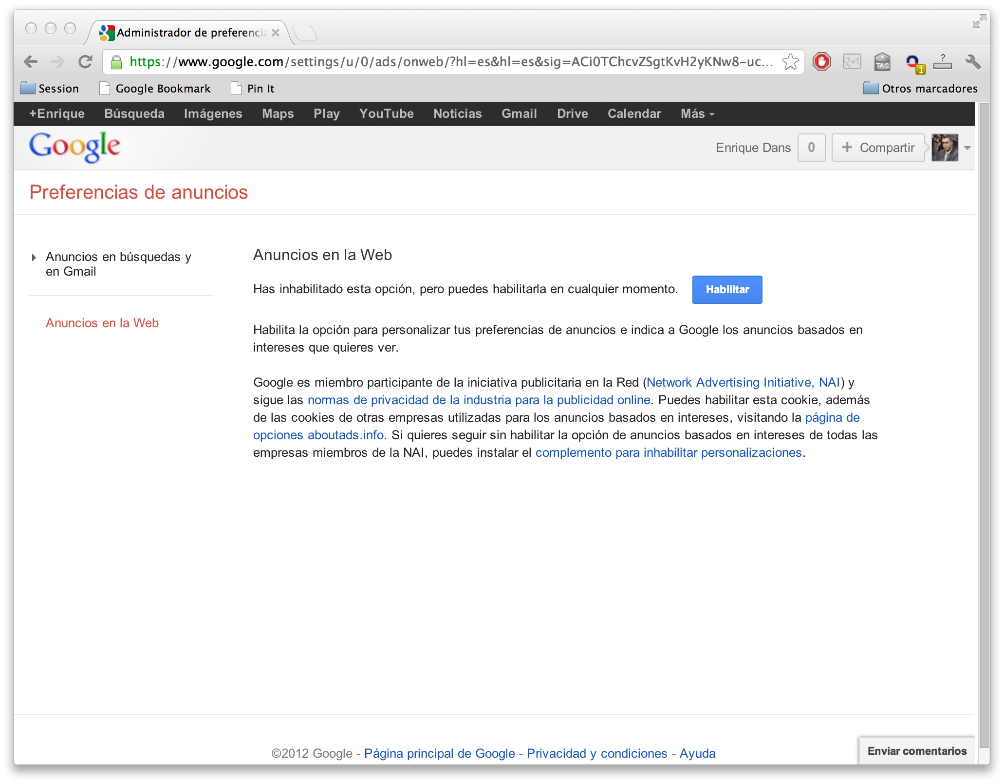 - Vete a la página que especifica tus preferencias de anuncios y, tras identificarte, inhabilita las dos opciones que te encontrarás, haz opt-out tanto de «Anuncios en búsquedas y en Gmail» como de «Anuncios en la web«. Hasta el momento, esta opción, relativamente oscura y enterrada en las preferencias del usuario, ha sido claramente minoritaria, pero es la que da permiso a Google para utilizar tus preferencias e intereses, para vender tus impactos publicitarios a los anunciantes por un importe mayor en base a su mayor nivel de cualificación. Bloqueando estas opciones no pierdes ninguno de los servicios de Google, simplemente recibirás publicidad más genérica, no basada en tus hábitos, y puedes volvera a activar las opciones en el momento que quieras.
