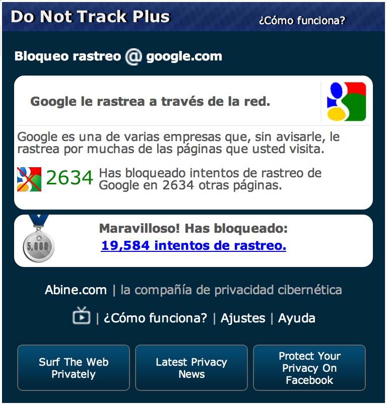 - Con estas dos acciones, ya hemos quitado de nuestra vista una parte muy significativa de la publicidad de Google, y además, se lo hemos dicho claramente. Ahora vamos a impedir que recopile información sobre nosotros: instálate DoNotTrack Plus (le dediqué un artículo no hace mucho) o Ghostery y bloquea específicamente el seguimiento de Google. Puedes aplicarlo en su totalidad o puedes excluir aquellos productos o páginas en los que notes algún tipo de problema, simplemente recuerda que lo tienes por si notas algún tipo de interferencia. Como en el caso del plugin anterior, todo es perfecta y fácilmente reversible.