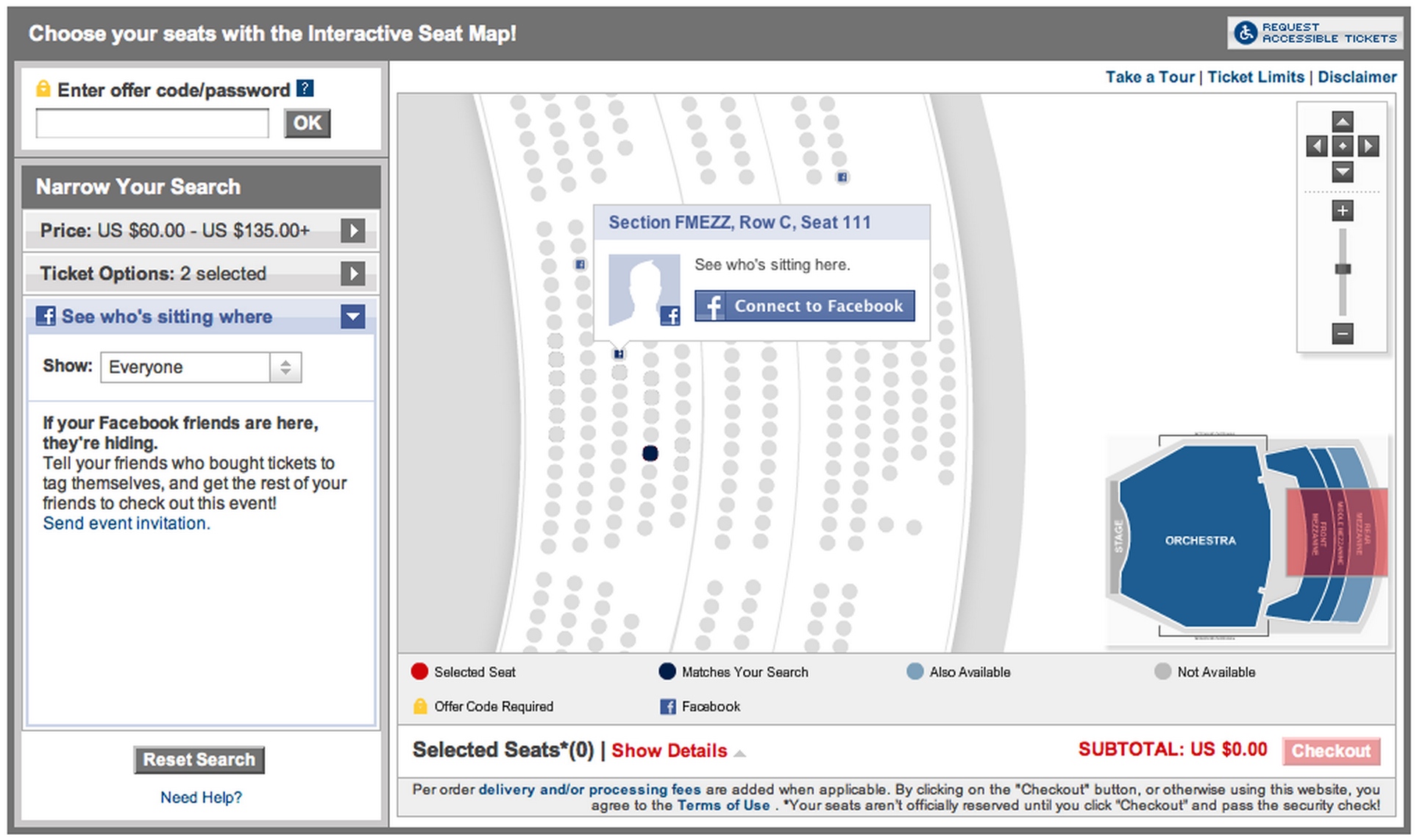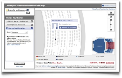 Investigando entradas de musicales en Nueva York mediante Ticketmaster me encuentro esta curiosa integración con Facebook lanzada hace algo más de un año que me ha llamado la atención, y que aparece en la captura de pantalla de la izquierda (puedes hacer clic para ampliar): en el momento de elegir butaca, te muestra un mapa en el que aparecen marcadas todas las personas de tu red que hayan confirmado asiento en esa misma sesión, para que puedas escogerlo a su lado – o bien huir de ellos si corresponde :-)