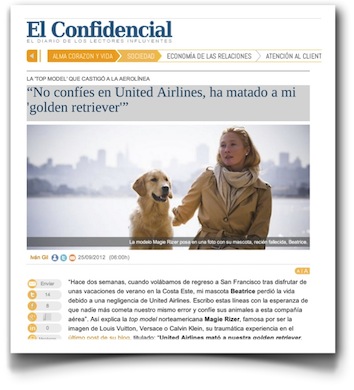 Iván Gil me llamó ayer para hablar del último problema de comunicación de United Airlines, y hoy me cita abundantemente en su artículo titulado «No confíes en United Airlines, ha matado a mi ‘golden retriever’«: una modelo norteamericana, Maggie Rizer, tuvo la desagradabilísima experiencia de encontrarse a su perra muerta en su jaula de transporte por un golpe de calor tras un viaje en avión, y vio cómo la aerolínea pretendía descargar su responsabilidad alegando un supuesto problema de salud del animal. Tras escribirlo en su página web, la historia se ha difundido por las redes sociales de manera inmediata, provocando un fuerte daño a la imagen de United (efectivamente, la misma United de «United breaks guitars«).