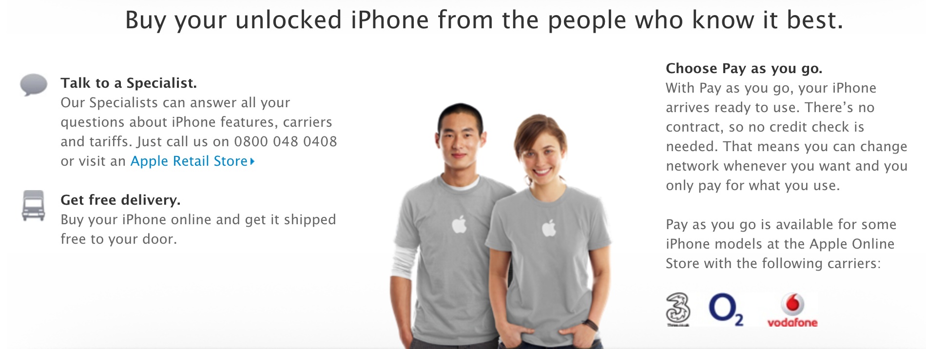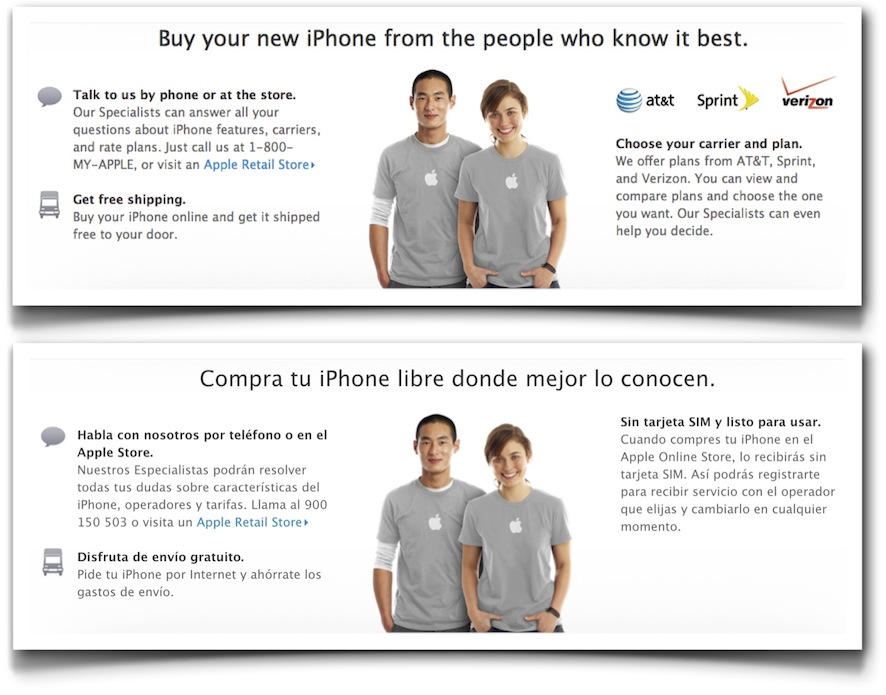 Me ha llamado la atención la comparación entre la página web de Apple para comprar el nuevo iPhone 5 en Estados Unidos frente a España: en ambos casos, las páginas animan lógicamente a adquirir el terminal en una tienda Apple, «donde mejor lo conocen» y, sobre todo, donde el margen para la marca es mayor. Pero mientras en los Estados Unidos la marca de la manzana reproduce los logotipos de los tres operadores que ofrecen el iPhone 5 y se reserva un papel neutral en el que aconseja a sus clientes sobre el operador y plan recomendable en función de sus circunstancias y uso, en España la marca dice directamente que te llevarás el terminal libre y sin tarjeta SIM, para que puedas «recibir servicio con el operador que elijas y cambiarlo en cualquier momento».
