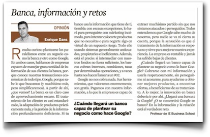 Mi columna de Expansión de esta semana se titula «Banca, información y retos» (pdf), e intenta hacer un somero ejercicio mental de comparación entre dos negocios que no suelo ver comparados, pero que creo que sí podemos extraer conclusiones interesante al hacerlo: Google frente a la banca. En ambos casos, negocios que manejan información de sus clientes, pero con percepciones muy diferentes: mientras Google es impresionantemente bueno a la hora de obtener esa información y de hacer que sus usuarios se sientan razonablemente cómodos con ello – algunos argüirán que no, que ellos preferirían que Google no tuviese esa información, pero históricamente, Google jamás ha tenido un descenso en su número de usuarios debido a una protesta derivada de este tema, y además, hay que recordar que esa información puede ser gestionada por el usuario, – la banca, en cambio, tiene por lo general y salvo honrosas excepciones verdaderos problemas para hacer algo útil con esa información, y cuando la utiliza, suele hacerlo de maneras profundamente primarias o negativas para el cliente.