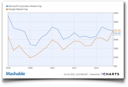 Era cuestión de tiempo, pero ocurrió ayer. El valor de la acción de Google subió un 0,7% hasta los 759,98 dólares, lo que da lugar a una capitalización bursátil de 249.200 millones de dólares. Al mismo tiempo, la cotización de Microsoft descendió un 0,3% hasta los $29,67 por acción, lo que la deja en una valoración de 248.700 millones.