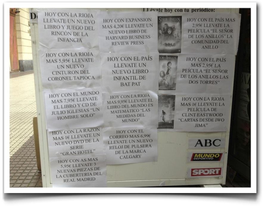 Un quiosquero de Logroño, intentando echar una mano a sus abrumados clientes. Si bajas a comprar el periódico de papel al quiosco, ya sabes, vete con una carretilla. Esto es lo que hay.