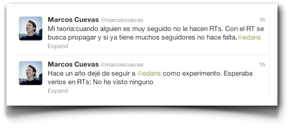 Estoy convencido de que el caso concreto de Enrique no es simétrico con el de Alfonso Alcántara y mucho menos con el de Marcos Cuevas. No solo es cosa de quién difunde qué, sino en qué tipo de seguidores tiene. No tiene, ni creo que pueda tener, la misma difusión un tweet de Madona o de Justyn Biever, incluso me atrevería a afirmar, de alguien como Jose María Iñigo, que uno de Enrique Dans. No creo que la gente retwitee todo lo que considera importante para él, sino lo que considera que le pueda interesar a quien le siga.