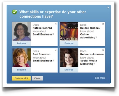 Ayer me encontré en mi buzón de correo una comunicación que, desde LinkedIn, me comentaba que varias personas habían «confirmado mis conocimientos» en varias áreas. Intrigado, entré, y me encontré con la posibilidad de aceptar que dichas confirmaciones (endorsements) aparecieran en mi perfil, y con una herramienta en forma de caja azul con cuatro perfiles de contactos míos en la red que me ofrecía, en un solo clic, la posibilidad de confirmar «si sabían o no» de un tema determinado.