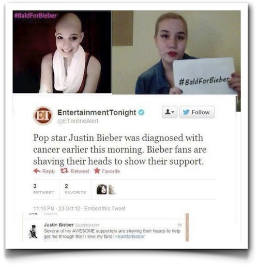 Una captura de un tweet aparentemente enviado desde la cuenta oficial de Entertainment Tonight afirma que Justin Bieber ha sido diagnosticado con cáncer, y que muchas de sus fans están afeitándose la cabeza para mostrar su apoyo al artista. Añádele una galería de fotos de fans para estimular el comportamiento grupal, y otro tweet, supuestamente desde la cuenta oficial de Bieber, en el que agradece el gesto, y ya tienes un trending topic, #BaldForBieber, rápidamente escalando en popularidad en Twitter. Y supuestamente, aunque nadie ha visto pruebas de esto, un montón de Beliebers con la cabeza pelada, un mensaje que «suena creíble», lo sea o no.