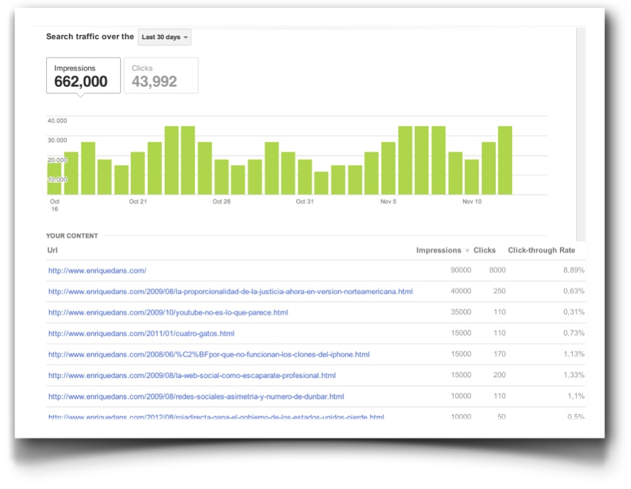 Al hacer clic sobre ella, me lleva a lo que veis en la ilustración, un gráfico que detalla el tráfico (impresiones, clics y tasa de clickthrough) a aquellos contenidos de los que soy autor (los que aparecen con mi foto de perfil a la izquierda), uno de los temas que me parecen más interesantes y prometedores desde que Google lo puso en marcha, pero sobre el que había investigado poco hasta el momento más allá de encontrármelo sistemáticamente en mis búsquedas. Si produces contenido y no lo has probado, te recomiendo que lo hagas ya.