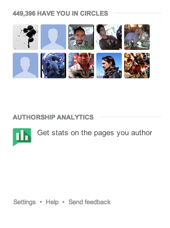 Ayer, en Google+, me llamó la atención ver un enlace nuevo: aparece en la sección de perfil, bajo la cuenta de personas que tienes en tus círculos y que te tienen en los suyos, y está etiquetada como «Authorship analytics«.