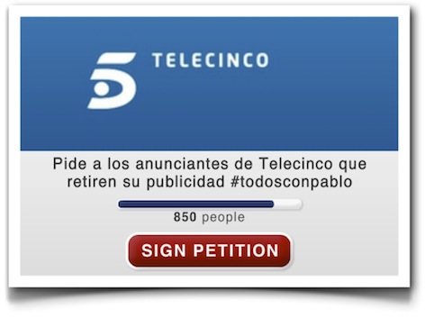 ACTUALIZACIÓN: La iniciativa en Change.org que pide a las marcas que retiren su publicidad de Telecinco hasta que la cadena retire su querella contra Pablo supera las sesenta mil firmas en menos de veinticuatro horas.