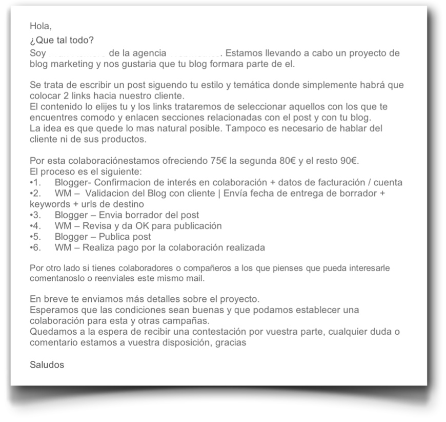 Por lo leído me suena a que esa agencia ha hecho un mailing masivo a todos los bloggers de su base de datos, sin tener en cuenta relevancia y autoridad del blogger al que se estaban dirigiendo.