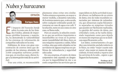 Mi columna de esta semana en el diario Expansión se titula «Nubes y huracanes» (pdf), y es un intento de concienciar a los directivos de la importancia de llevar sus funciones críticas empresariales relacionadas con la gestión de información hacia un modelo de nube gestionada profesionalmente, con planes de contingencia y prevención de desastres. Básicamente, intentar aprovechar un poco el efecto «cuando las barbas de tu vecino veas pelar, pon las tuyas a remojar» al hilo de los efectos del reciente huracán Sandy sobre la costa este de los Estados Unidos, y el impacto que tuvo sobre la continuidad de numerosas empresas.