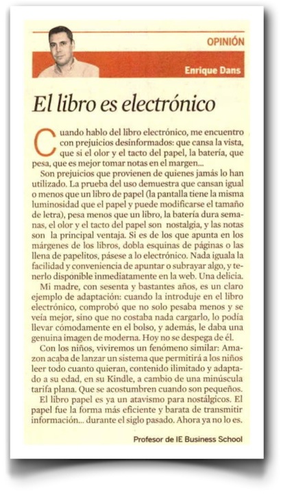 Mi columna de esta semana en Expansión continúa el tema de la transición del papel a los bits, y lo adapta para el público del diario económico. En la práctica, un tipo de lectura, el más orientado al desarrollo de conocimientos y habilidades, ya ha experimentado dicha transición, y el uso del libro electrónico se ha convertido ya en lo que separa a quienes son capaces de llevar a cabo un aprovechamiento completo y eficiente de la lectura, de aquellos que «simplemente leen». Pero los usos y las propuestas de valor, en realidad, van mucho más allá, y abarcan a todos los demográficos.