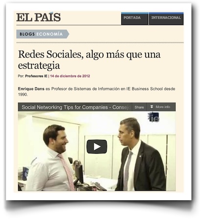 Me pidieron que grabase un pequeño vídeo para Vía@IEBusiness, el blog de IE Business School en El País, así que hablé en un formato muy breve sobre lo que es para mí uno de los temas peor interpretados por las compañías en estos tiempos que vivimos: la diferencia entre «estar en las redes sociales», algo que para mí no constituye como tal una estrategia y que suele dar lugar a presencias erráticas, inútiles o directamente absurdas, y planificar una verdadera estrategia de web social.