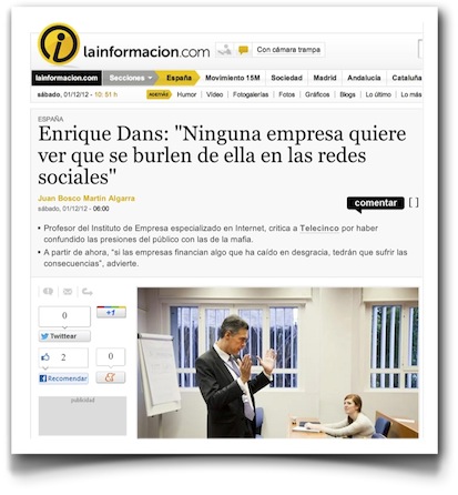 El artículo se ha publicado hoy bajo el título «Enrique Dans: ‘Ninguna empresa quiere ver que se burlen de ella en las redes sociales’«.
