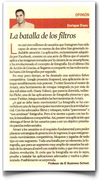 Mi columna de esta semana en Expansión se titula «La batalla de los filtros» (pdf), y es una revisión rápida y «para todos los públicos» del nuevo panorama que se genera con la irrupción en lo que era el «territorio Instagram» (casi cien millones de usuarios en menos de dos años) de empresas como Google con su Snapseed, o Twitter y Yahoo! con la integración del SDK de Aviary y la resurrección de la tan querida Flickr.