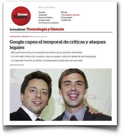 Aurora Muñoz, de ZoomNews, me llamó hace unos días para hablar sobre Google, su hegemonía y su posible crisis comentada como tendencia en un artículo de The Economist, y el pasado domingo publicó un artículo titulado «Google capea el temporal de críticas y ataques legales«, en el que me cita.
