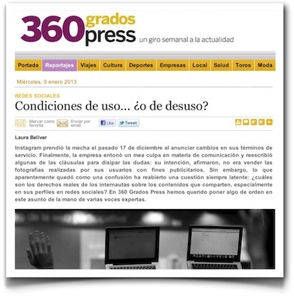 Laura Bellver, de 360 Grados Press, me contactó por teléfono para hacerme algunas preguntas sobre el asunto Instagram en particular y los términos de servicio en general, y hoy ha publicado su artículo titulado «Condiciones de uso… ¿o de desuso?, en el que me cita.