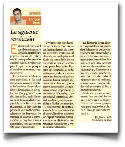 Mi columna de esta semana en Expansión se titula «La siguiente revolución» (pdf), y trata de situar el momento actual en cuanto a las tecnologías de impresión 3D, fabricación personal, DIY y toda la tendencia que empezó a plasmar Neil Gershenfeld en 2008 con «Fab« y ha retratado Chris Anderson con su «Makers« el pasado año, al mismo nivel que lo que significó la llegada y popularización de internet. Cuanto más investigo este tema, más me parece que estamos ante un cambio que va a afectar absolutamente todo, redefinir todos los niveles de la economía y convertirse en una nueva Revolución Industrial. Sí, así de grande. Si sigues viendo en este tema a cuatro chalados imprimiendo tonterías en plan hobby… vuélvelo a mirar.