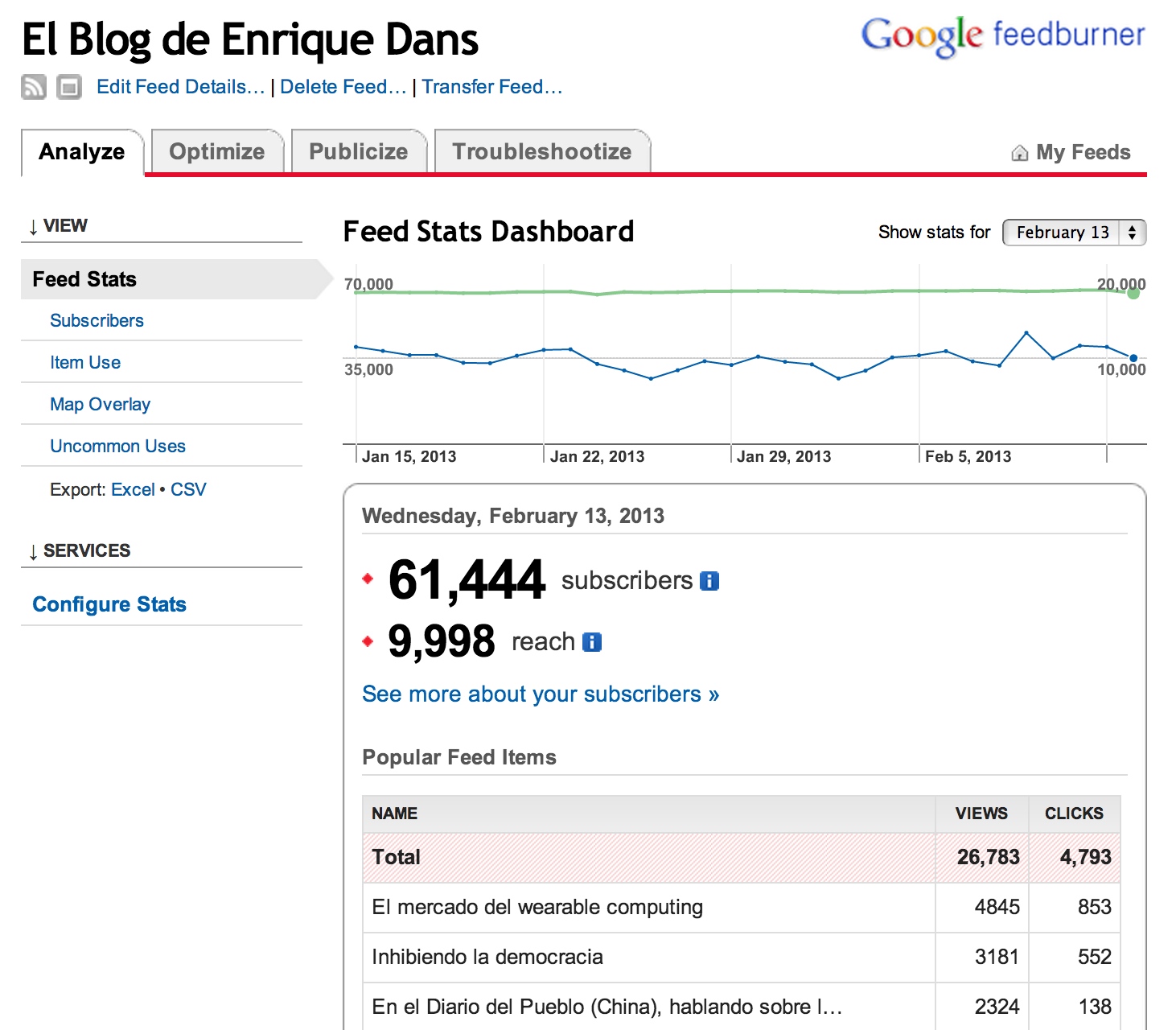 Mediafed es la empresa que gestiona la publicidad en mi feed RSS desde marzo del año pasado, y la responsable por tanto de los anuncios que veis en ocasiones cuando consumís mi contenido a través de lectores de feeds o del correo electrónico (como siempre, siguiendo un modelo de publicidad respetuosa: nunca formatos extensibles, ni pop-ups, ni pop-unders, ni intersticiales, ni sonido o vídeo preactivado). El crecimiento de las vías alternativas de acceso a los contenidos es completamente imparable: en un día normal, esta página puede tener alrededor de unas diez mil visualizaciones de páginas desde la web, y ese número mantiene un comportamiento estable desde hace ya varios años. Sin embargo, recibe unas diez mil visitas adicionales de los más de sesenta mil suscriptores al feed RSS gestionado mediante Feedburner, y sus contenidos son además recibidos por correo electrónico cada mañana por unas cinco mil quinientas personas más con direcciones verificadas (la suscripción se anula tras cinco intentos de envío infructuosos) que escogen ese método. En su momento tuve algunas invitaciones para desarrollar una app para la página, pero me dio la impresión de que no era necesario: tener que instalarse una aplicación para leer únicamente el contenido de una página personal que publica habitualmente una entrada al día me parecía que no tenía demasiada lógica.