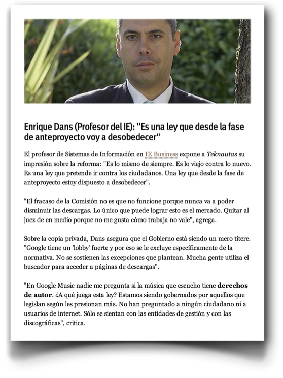 Ayer me llamaron desde El Confidencial para hablar sobre la reforma de la ley de propiedad intelectual perpetrada por el gobierno, y hoy lo han publicado bajo el título «Internet clama contra la reforma de la ley de Propiedad Intelectual«.