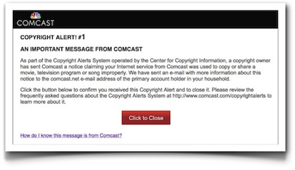 El sistema de seis avisos (Six Strikes o Copyright Alert System) que el gobierno de los Estados Unidos ha pedido a los proveedores de acceso a internet que desarrollen, dejándoles libertad sobre cómo hacerlo, empieza a funcionar, y algunos usuarios empiezan a recibir las primeras alertas en correo electrónico o en sus navegadores. La de Comcast que podéis ver en la ilustración es una de ellas. El sistema no toma la forma de una ley, sino simplemente de un «acuerdo voluntario entre la industria de los contenidos y los ISP».