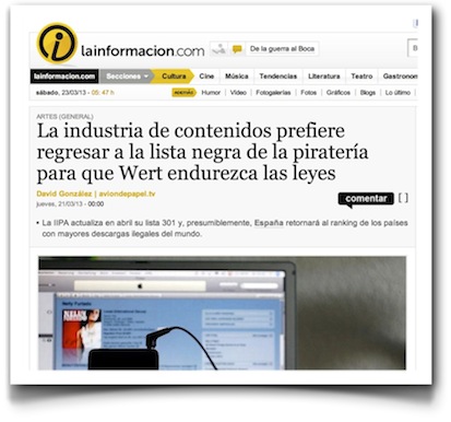 David González me llamó para hablar sobre la posible vuelta de España a la llamada Lista 301, sobre la que he hablado en múltiples ocasiones, y sobre la actitud de una industria de contenidos que prefiere claramente – o incluso promueve activamente, como ya ha hecho en otras ocasiones – que nuestro país esté en esa lista como forma de presionar al gobierno para que la favorezca en sus decisiones. El pasado jueves publicó algunas citas de nuestra conversación en La Información bajo el título «La industria de contenidos prefiere regresar a la lista negra de la piratería para que Wert endurezca las leyes«.