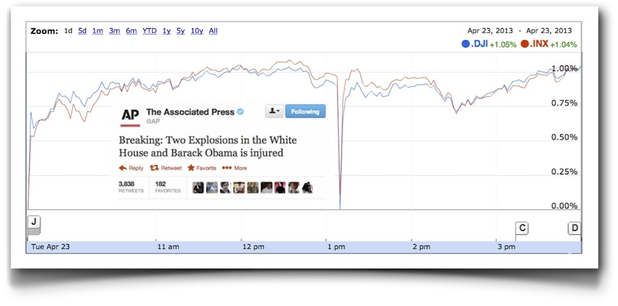 El gráfico muestra el impacto sobre la cotización de los índices S&P500 y Dow Jones Industrial Average de un falso tweet proveniente de la cuenta hackeada de Associated Press: simplemente, parece ser que alguien obtuvo acceso a las claves de la cuenta mediante un correo electrónico con una dirección falsificada, insertó ese tweet algo después de la una de la tarde en hora de Nueva York, y disparó todas las alarmas hasta que pudo ser desmentido y la cuenta suspendida. La acción parece haber sido reivindicada por un supuesto Syrian Electronic Army, un grupo que apoya al gobierno de Siria. El impacto sobre el Dow fue de 143 puntos, desde los 14.697 hasta los 14.554, para recuperarse poco después. En paralelo, varias cuentas de CBS fueron también hackeadas supuestamente desde la misma organización, y se insertaron varios mensajes de denuncia y protesta.