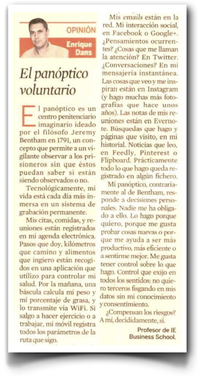 Mi columna en Expansión de esta semana se titula «El panóptico voluntario» (pdf), y es una pequeña reflexión sobre la cantidad de aspectos de nuestras vidas que están pasando a estar reflejados de alguna manera en algún tipo de fichero log, de manera voluntaria, bien por aprovechar prestaciones de servicios que se presentan como superiores, o por ganar en nivel percibido de control. El resultado es seguramente una columna poco sorprendente para el lector medio de una página como esta, pero puede que algo más para el lector habitual de prensa papel. La referencia final al tema del control, obviamente, daba para escribir mucho más, pero la dejé ahí por las restricciones de espacio, posiblemente lo retome en otra columna más específica.