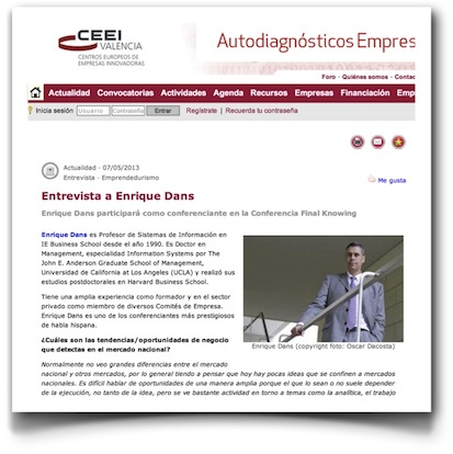 Pablo Ceinos me envió esta pequeña entrevista por correo electrónico para la página Emprenemjunts del Centro Europeo de Empresas Innovadoras de Valencia (CEEI), en preparación de una jornada, la Conferencia Final Knowing, que tendremos allí el próximo día 23 de mayo.
