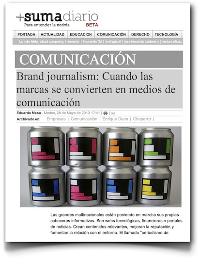Eduardo Mesa me envió por correo electrónico un cuestionario sobre el llamado brand journalism, y ayer algunas de mis respuestas aparecieron publicadas en Sumadiario bajo el título «Brand journalism: Cuando las marcas se convierten en medios de comunicación» (con el detalle autorreferente de que precisamente Sumadiario no deja de ser un ejercicio de brand journalism en sí mismo).