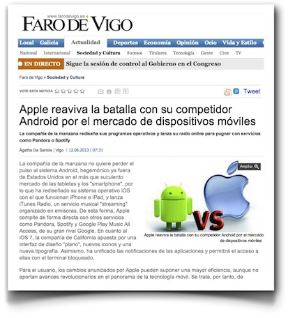 Ágatha de Santos, de Faro de Vigo, me llamó para hablar acerca de los anuncios de Apple en la reciente WWDC 2013, fundamentalmente para determinar una calificación de los mismos en términos de relevancia, y hoy publica algunos de mis comentarios bajo el título «Apple reaviva la batalla con su competidor Android por el mercado de dispositivos móviles«.
