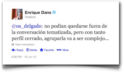 Ayer respondí en un rato perdido y desde el móvil a una pregunta a través de Twitter de Óscar Delgado, y hoy me encuentro con que ese tweet mío aparece citado en un artículo en 360 grados titulado «El hashtag ha llegado a Facebook, ¿y ahora qué?«. La verdad es que es interesante este formato de la «twitt-entrevista», creo que es la primera vez que me pasa :-)