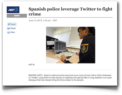 El pasado viernes mantuve una entrevista con France Presse acerca del uso de Twitter de la Policía Nacional española y, como suele ocurrir con las entrevistas de agencia, he visto ya citas a la misma en varios medios, como en esta página en inglés o esta otra en español.