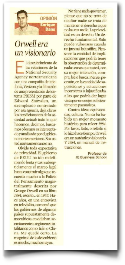 Mi columna de esta semana en el diario Expansión se titula «Orwell era un visionario» (pdf), y es una breve reflexión sobre el escándalo del espionaje masivo de la NSA norteamericana a través de operadoras telefónicas como Verizon, o de varias empresas de servicios en la red. Sobre todo, un intento por desarmar esa absurda y tóxica idea de que «si no tengo nada que ocultar, no tengo nada que temer», y por llevar al lector a la verdadera magnitud de lo que hemos podido comprobar con nuestros propios ojos que está ocurriendo: la construcción de todo un macrosistema de vigilancia de todos los ciudadanos, una sociedad disfuncional, un auténtico estado policial en el que todos los elementos del contrato social han cambiado sin consentimiento expreso de nadie para convertir el mundo en que vivimos en la traslación perfecta y prácticamente literal del «1984» de Orwell.