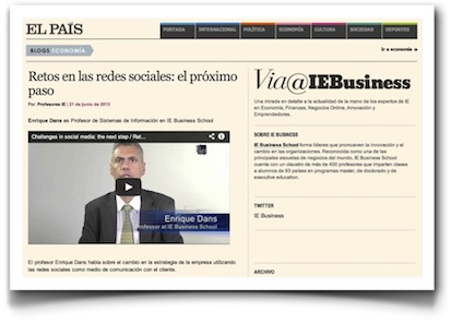 Me pidieron un breve vídeo de tres minutos para la sección Vía@IEBusiness de El País, al hilo de una jornada que hicimos con Oracle sobre los retos de la web social de cara a los entornos corporativos.