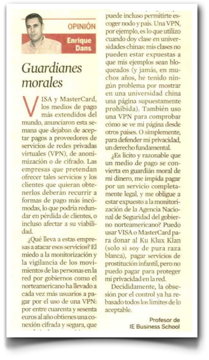 Mi columna de Expansión de esta semana se titula «Dinero y guardianes morales» (pdf), y se refiere a los indicios que apuntan a que algunas compañías emisoras de tarjetas de crédito como Visa o MasterCard podrían estar bloqueando los pagos a empresas que ofrecen servicios de redes privadas virtuales (VPN), cifrado o anonimización, según informan diversas publicaciones.