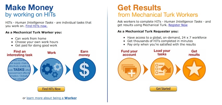 El Mechanical Turk es una plataforma de mercado digital lanzada en noviembre de 2005 y definida dentro de los Web Services de Amazon, que sirve para trabajos simples y de bajo precio unitario que requieren un cierto nivel de inteligencia o capacidad de discernimiento humanas, que una máquina no puede hacer o que sería muy caro o complicado programar, y que son por tanto ofrecidos a personas. Lo habitual es encontrar operaciones – llamadas HITs, o Human Intelligence Tasks – muy sencillas, como categorizar fotos en una base de datos, etiquetar caras, copiar manualmente precios y productos de facturas, resolver captchas, escribir transcripciones literales, etc. que suelen llevar menos de un minuto, son repetitivos, mecánicos, se pagan en torno a pocos céntimos por unidad, y que habitualmente permiten que cualquier persona del mundo con una conexión a la red pueda obtener salarios que generalmente están entre el dólar y los cinco dólares por hora, por debajo del salario mínimo de la mayoría de los países occidentales. Aunque los trabajadores ecogen libremente los trabajos, pueden llevarlos a cabo en las condiciones que estimen oportunas, y el sueldo obtenido puede incluso llegar a ser atractivo en algunos entornos, muchos definen el Mechanical Turk de Amazon, cuyo nombre proviene de un falso autómata diseñado por Wolfgang von Kempelen en 1769, como un auténtico taller digital de trabajo esclavo que practica la explotación: el trabajo se factura como contratado laboral autónomo independiente, y deja a Amazon un 10% de comisión.